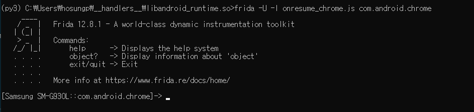간단하게 크롬 앱을 실행한 후, frida -U -l class_print.js com.android.chrome 명령어를 실행하여