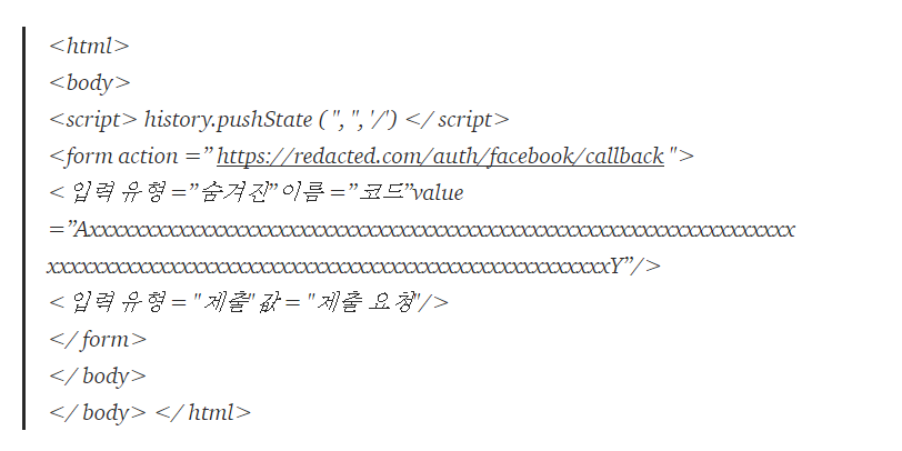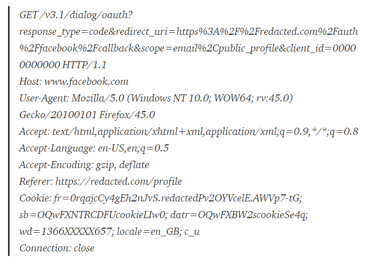 Facebook 아이콘을 클릭하여 OAuth인증을 시도하는 최초 패킷을 Burp로 잡아보면 아래와 같은 내용을 확인할 수 있었다. 해당 패킷에서 파라미터를 확인 시 state에 대한 파라미터가 존재하지 않았고, 이는 CSRF 공격에 취약할 수 있음을 의미한다. Facebook에 성공적으로 인증한 후 발급된 Authorization 키를 이용해 redacated.com 서비스에 인증을 시도하는 Facebook에서의 콜백을 가로챌 수 있다.