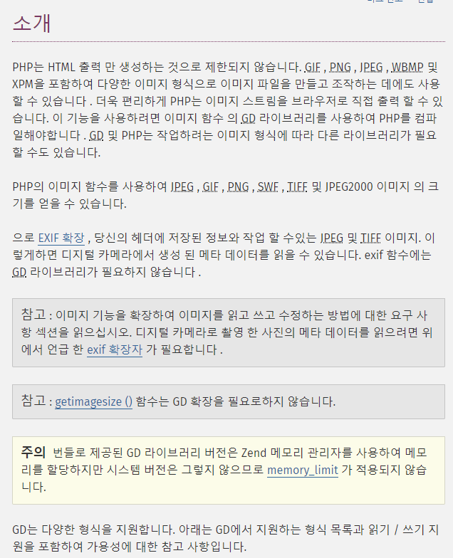 : PHP-GD는 PHP의 라이브러리 중 하나로, GIF , PNG , JPEG , WBMP 및 XPM을포함하여 다양한 이미지 형식으로 이미지 파일을 재생성하고, EXIF 헤더값에 저장된 메타데이터를 읽을 수 있습니다.
