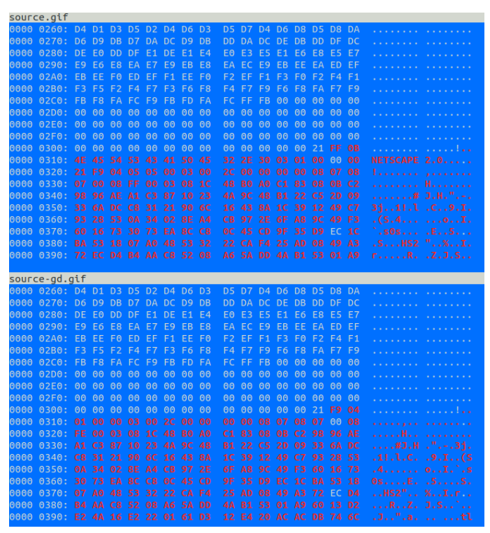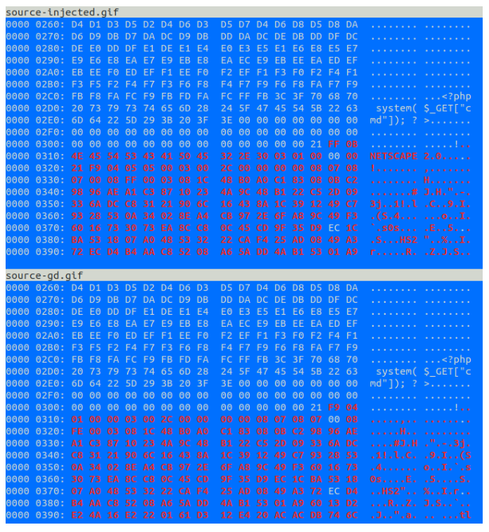 php-gd로 GIF 이미지를 재생성하면 NULL 바이트 블록이 제거되지 않음을 확인할 수 있습니다.